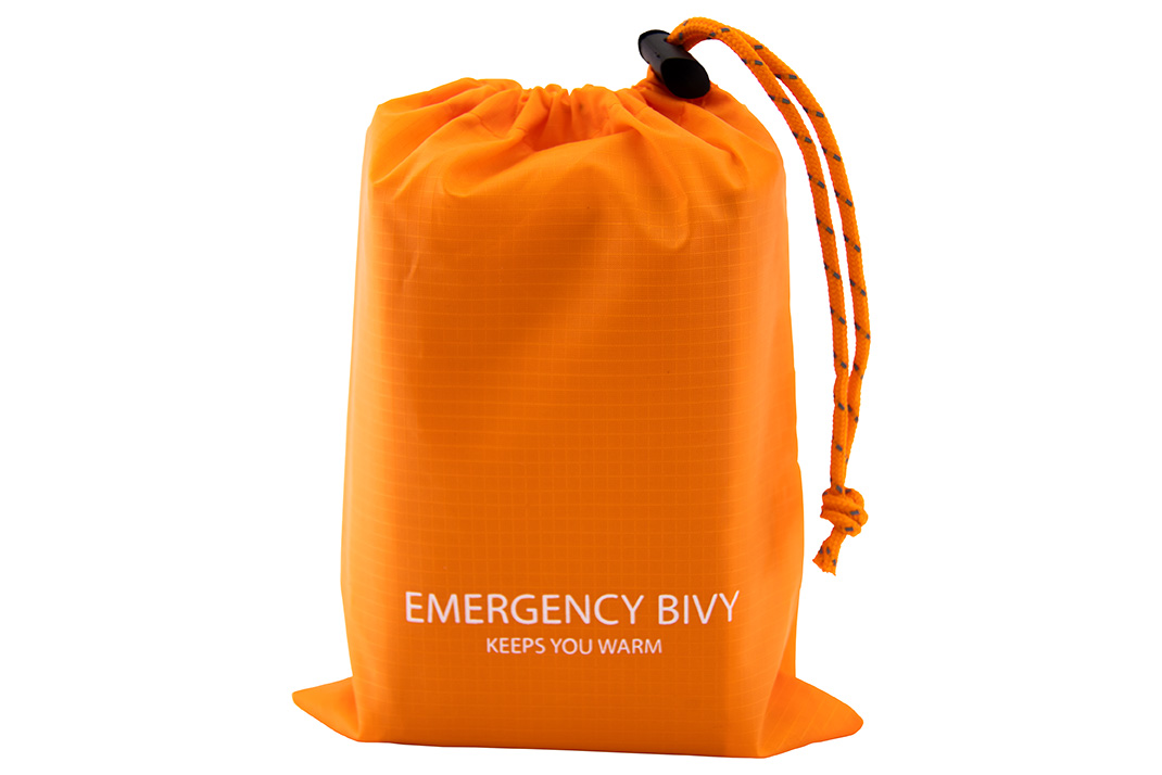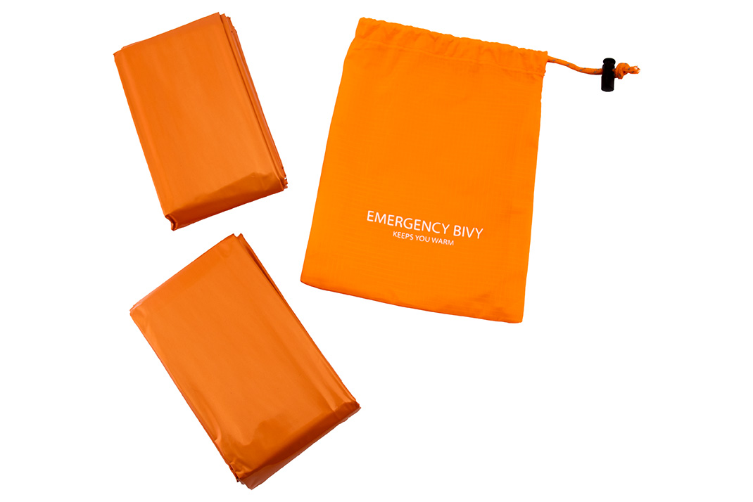 The emergency sleeping bags are delivered in a pack of 2 in a clear orange storage bag with the text "Emergency Bivy" printed on the bag.